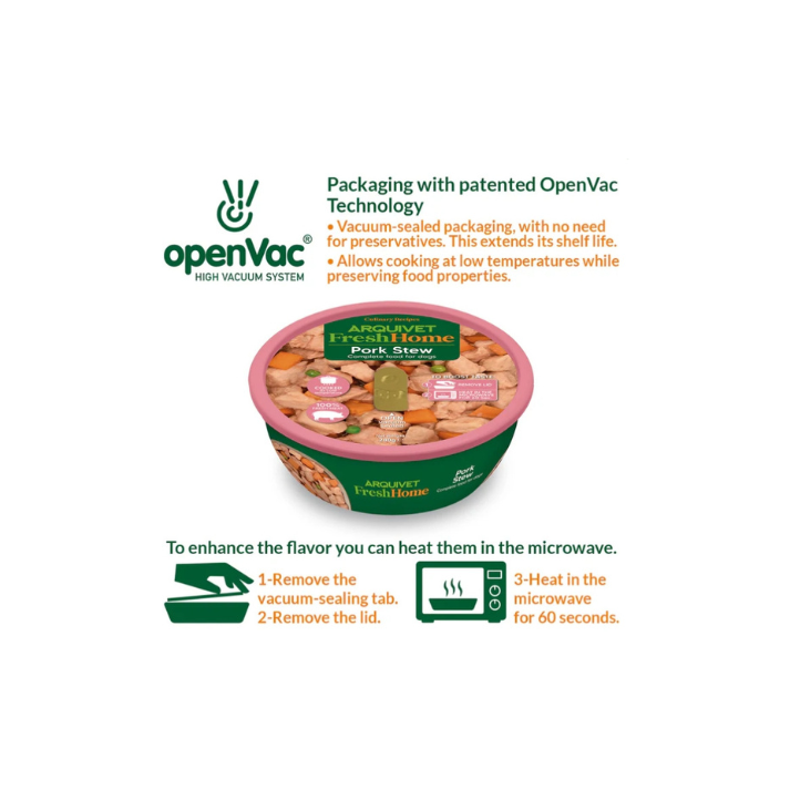 Composición: 97% cerdo fresco en su salsa, guisantes, zanahorias, boniato, especias.