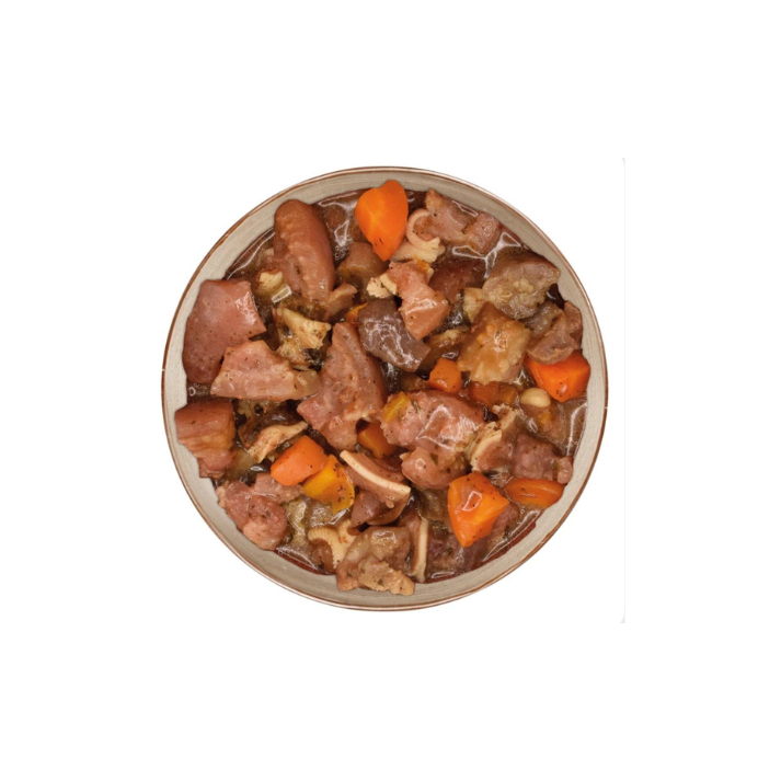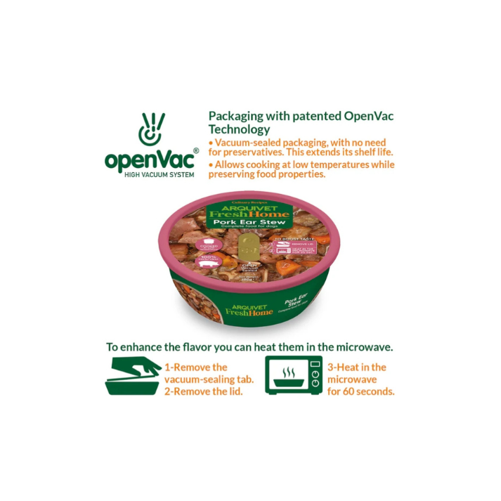 Composición: 97% oreja de cerdo fresca en su salsa, guisantes, zanahorias, boniato, especias.