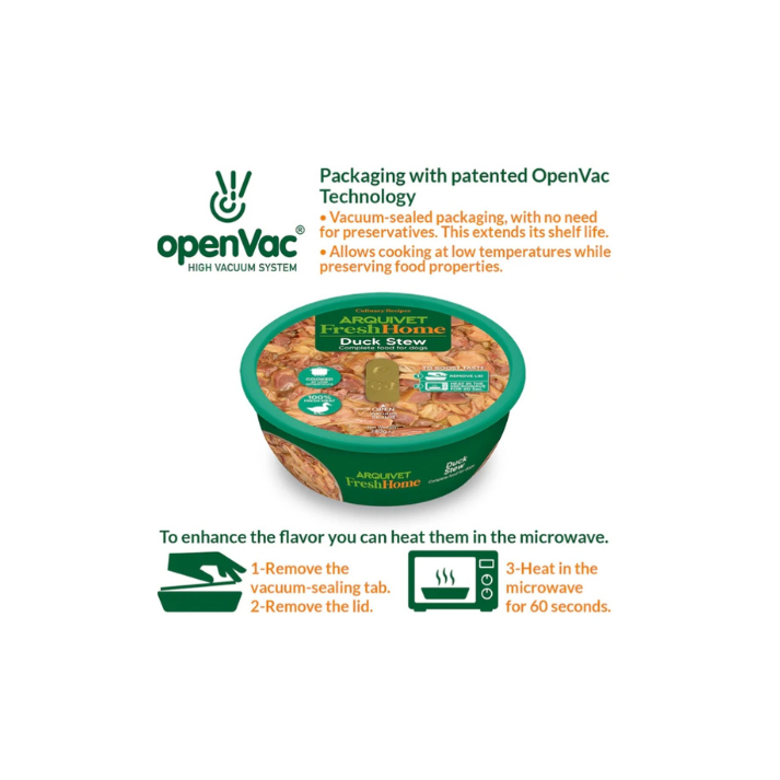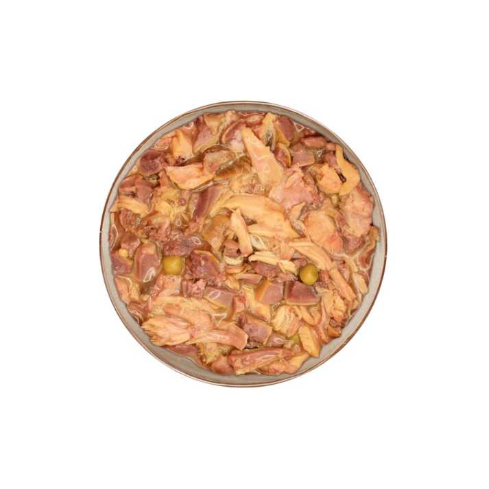 Estofado de Pato. Alimento húmedo completo para perros. Receta casera, cocinada a fuego lento como en casa, 100% natural y equilibrada. Ideal para perros de todas las edades, incluidos aquellos con estómagos sensibles o alergias alimentarias. Puede servirse como única comida o utilizarse como “topping” delicioso aportando un extra de sabor y aroma al alimento seco.