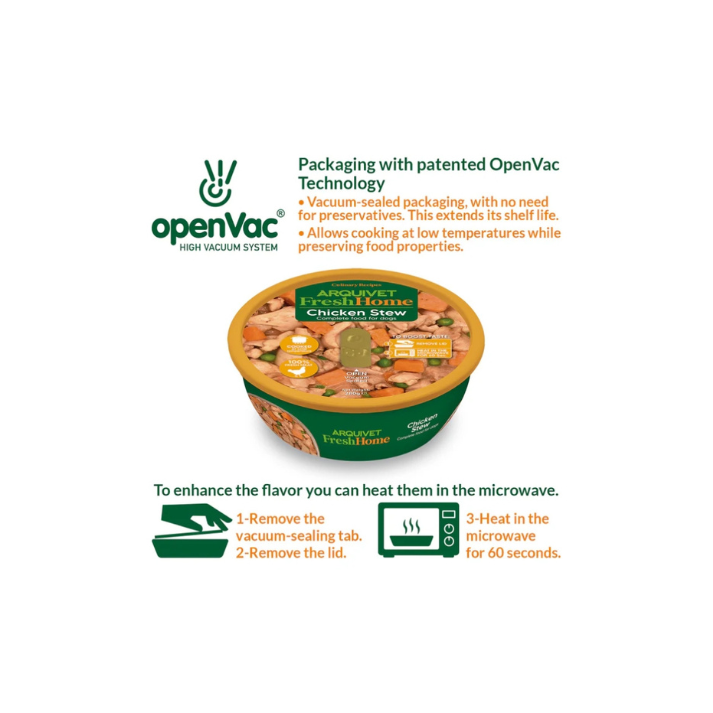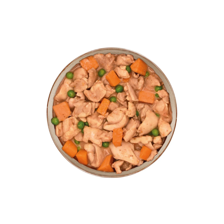 Estofado de Pollo. Alimento húmedo completo para perros. Receta casera, cocinada a fuego lento como en casa, 100% natural y equilibrada. Ideal para perros de todas las edades, incluidos aquellos con estómagos sensibles o alergias alimentarias. Puede servirse como única comida o utilizarse como “topping” delicioso aportando un extra de sabor y aroma al alimento seco.